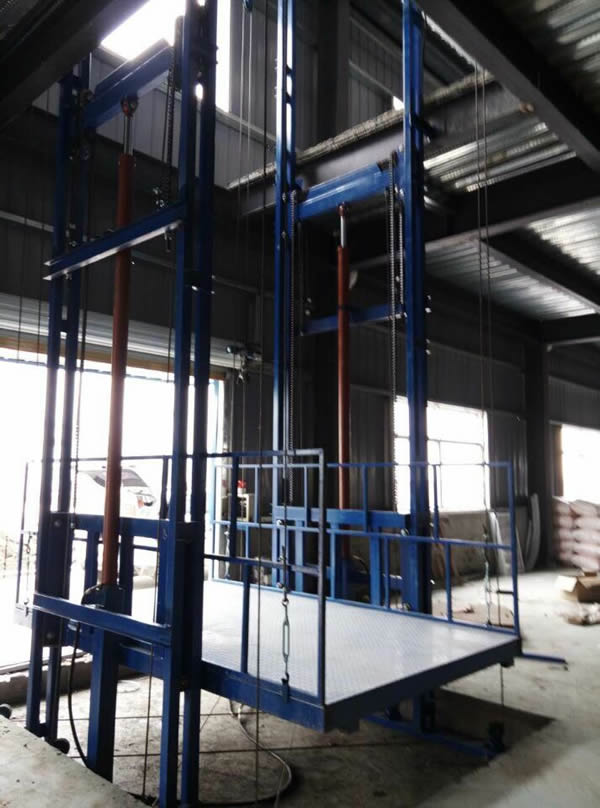 导轨式升降机,主要用于楼层间高空货物运输。主要用在载重量轻,台面尺寸要求比较小的环境.载重1-3吨,升高高度1-25米.室内、室外均可安装导轨式升降机也叫做液压提升机,提升高度高,采用旁置油缸,运行平稳、噪音低、维修方便、使用寿命较长;停电时,可使用手动应急下降,安全、方便、快捷、实用;地坑深度一般为15cm-30cm,顶层高度不受限制,可根据现场环境定做用.
